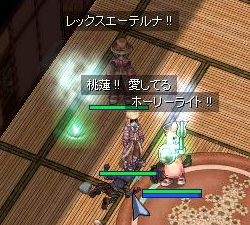 無理いって、発光まで付き合ってもらおうかとも思っとったらもともとそのつもりだったらしく、同じく光る気満々で狩りしてました。(そのわりにはミスしまくりだったとかいっちゃだめえ